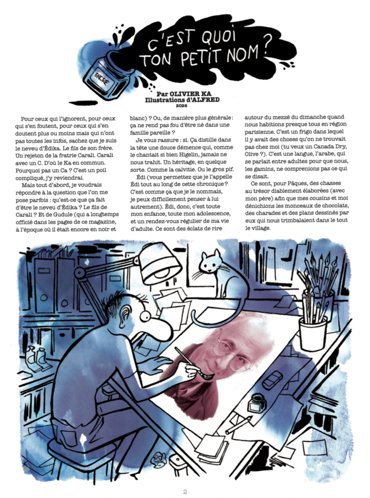 Fluide Glacial, journal créé par Gotlib auquel je participe régulièrement aujourd'hui, lui rend hommage à travers un hors-série disponible en kiosques depuis le 12 février (et pendant trois mois). J'ai écrit, pour l'occasion, un texte-souvenirs jalonnés d'anecdotes concernant mon enfance à ses côtés et l'orthographe de nos noms qui est un joyeux bordel. J'ai demandé à Alfred, mon pote de coeur, de l'illustrer, ce qu'il à fait avec le talent et la tendresse qu'on lui connaît.